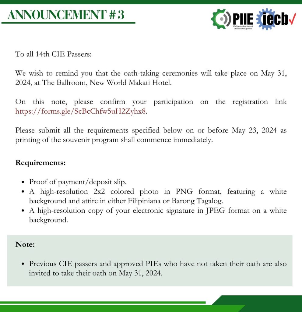 Previous CIE Passers and Approved PIEs who have not taken their oath are also invited to take their oath on May 31, 2024.