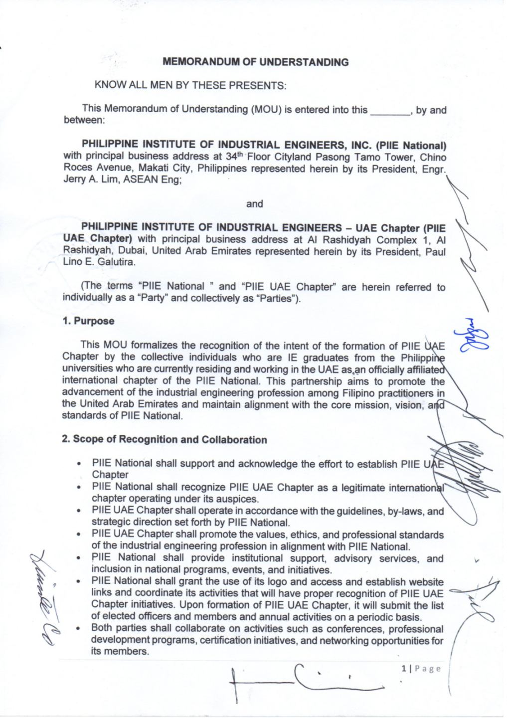 This MOU formalizes the recognition of the intent of the formation of PIIE UAE Chapter by the collective individuals who are IE graduates from the Philippine universities who are currently residing and working in the UAE as, an officially affiliated international chapter of the PIIE National. This partnership aims to promote the advancement of the Industrial Engineering Profession among Filipino practitioners in the United Arab Emirates and maintain alignment with the core mission, vision, and standards of PIIE National. - Scope of Recognition and Collaboration
